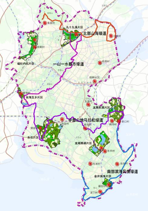 本次规划从乡村地区空间要素的主要特点出发,以“面状”的非建设斑块为主体,以“线状”的绿色廊道为网络,串接点状的乡村空间,形成一个“点-线-面”结合的全域乡村地区空间结构。