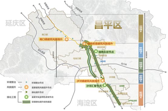 根据项目紧要性,实行分类分期实施,近期重点对沿线可视范围的村庄建筑风貌及重要的公共空间及绿化进行提升。近期实施范围涵盖昌平区南口镇、城南街道、城北街道、沙河镇、史各庄街道等京藏高速沿线区域,具体内容包括建筑风貌提升、公共空间重塑及沿线环境治理等建设内容。