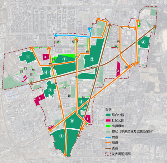 花乡街道在花园城市的建设中与上位政策及规划紧密衔接,积极响应了国家、北京市和区级层面要求。结合辖区重点道路,花乡街道精心打造了九条景观廊道,并细分为绿道、碧道和秀道三种类型,为居民和游客营造出多样化的休闲空间。同时,合理设置绿地,构建十个综合公园、若干社区公园及诸多小微绿地三类绿地体系,实现均衡覆盖。通过合理的规划布局,花乡街道构建出“九廊、三道、十园、多点”的可持续发展花园城市建设格局,不仅提升了城市颜值,更助力营造出宜居、宜游、宜业的花园城市典范,让居民生活品质与城市生态环境实现双提升。